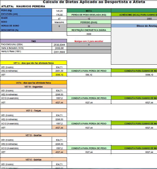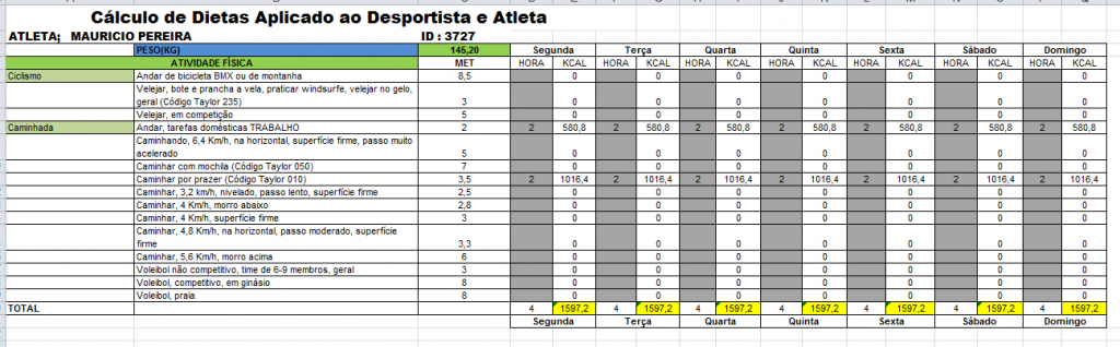 PLANILHA DE CÁLCULO CALÓRICO APLICADO AO DESPORTISTA E ATLETA COM VÁRIAS ATIVIDADES FÍSICAS E ROTINEIRAS DO NOSSO COTIDIANO, OBJETIVO É MEDIR TUDO QUE VOCÊ FAZ DE SEGUNDA A DOMINGO E TRAÇAR A ESTRATÉGIA DE QUANTO KG VAMOS TIRAR DE GORDURA POR SEMANA.